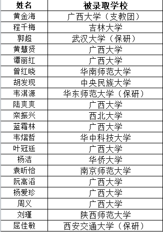 广西大学马克思主义学院哲学专业2018级1班共50人,共有20人顺利获得攻读研究生资格。其中,保研至985院校武汉大学、华东师范大学、西安交通大学3人,考研上岸985院校吉林大学、华中科技大学、中央民族大学3人,广西大学研究生支教团1人,其他211院校12人。