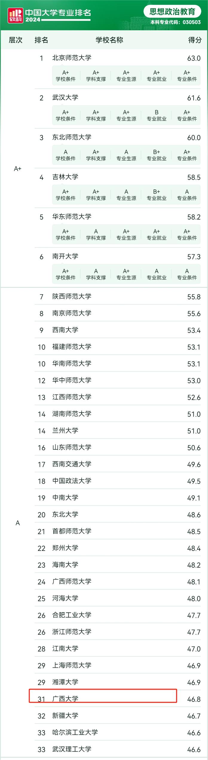6月13日,高等教育专业评价机构软科正式发布“2024软科中国大学专业排名”。我院思想政治教育专业排名全国第31位,获评A类层次,与2023年相比上升3位。