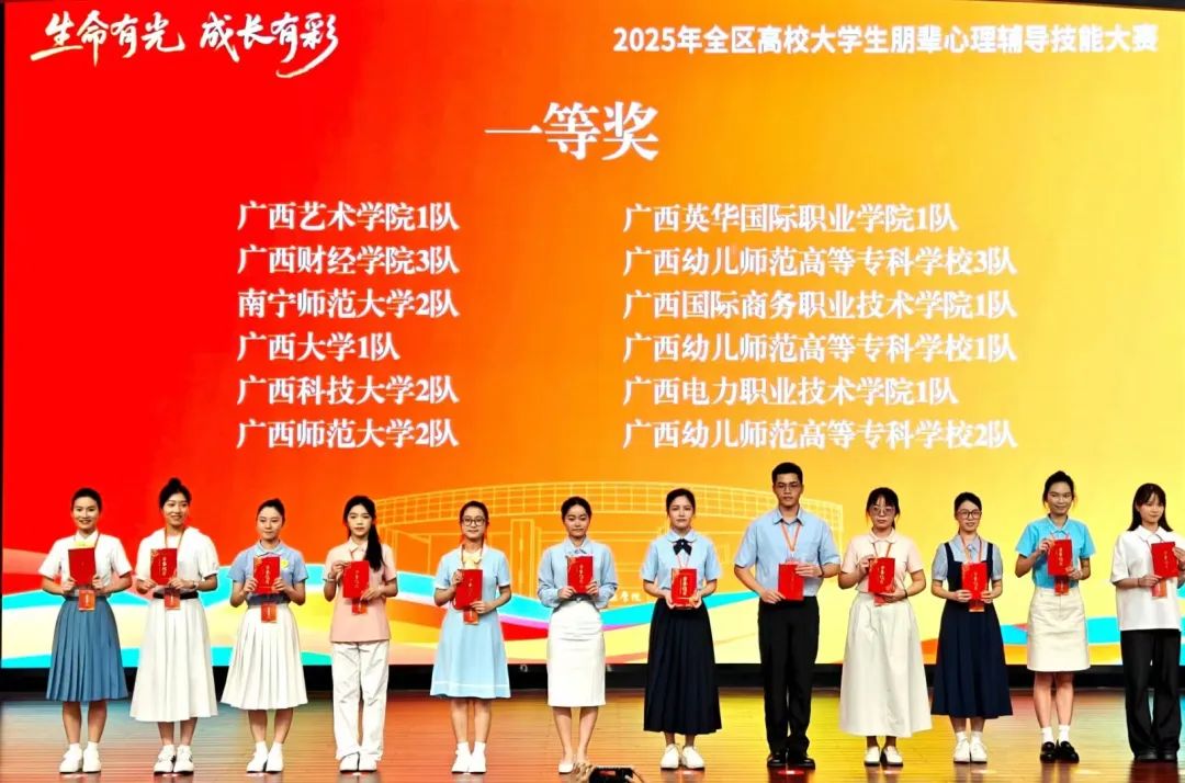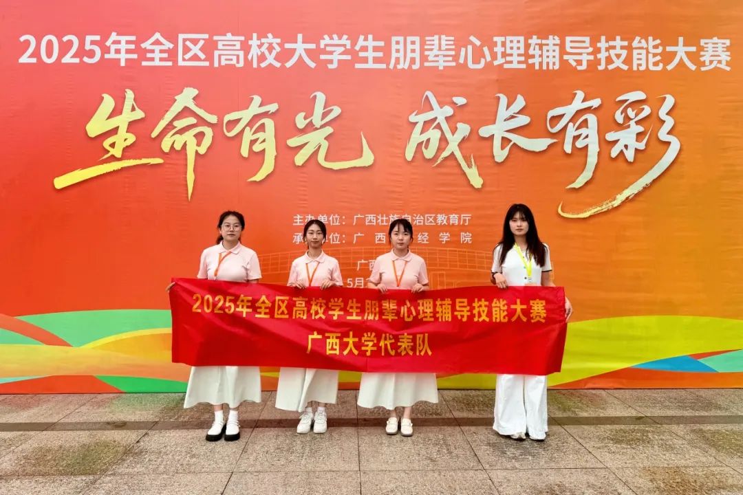 5月24日,由自治区教育厅主办的2025年全区高校大学生朋辈心理辅导技能大赛顺利落下帷幕。本次大赛主题为“生命有光,成长有彩”,共吸引了全区83所高校超66万名学生参与线上答题,并产生了118支队伍会师决赛。其中,我院学生薛景丹、宋姿娴所在的广西大学代表队在本次比赛中荣获一等奖。