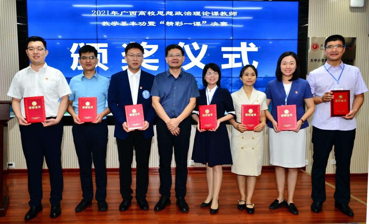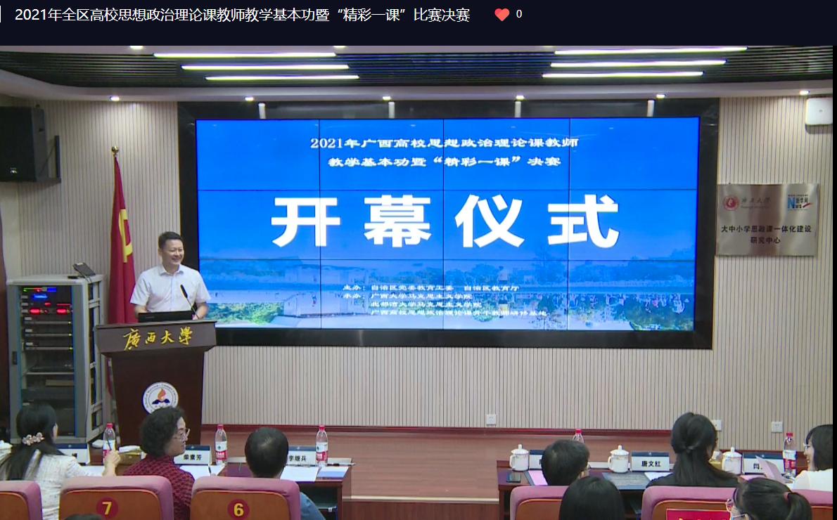 为深入贯彻落实习近平总书记关于深化思想政治理论课改革创新和加强“四史”教育的重要指示精神,充分发挥思想政治理论课铸魂育人作用,推动广西高校思政课高质量发展,进一步提升思政课教师教育教学整体素质,培养和选拔优秀思政教育人才,充分发挥思政课骨干教师理念引领、教学示范和科研带动等作用,2021年9月25日,由自治区党委教育工委、自治区教育厅主办,广西大学马克思主义学院、北部湾大学马克思主义学院、广西高校思想政治理论课骨干教师研修基地(广西大学)承办的2021年广西高校思想政治理论课教师教学基本功暨“精彩一课”决赛在我院举行。
