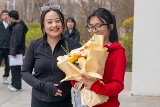 考场外,翘首以盼的家长向孩子献上鲜花与祝福,形成一道温馨的风景线。