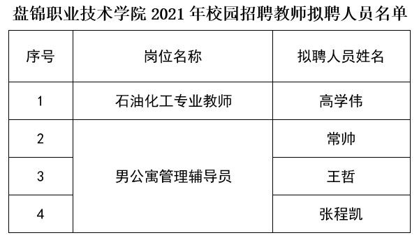 现将盘锦职业技术学院2021年校园招聘教师拟聘人员名单公示如下: