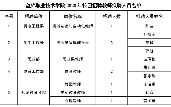 现将盘锦职业技术学院2020年校园招聘教师拟聘人员名单公示如下: