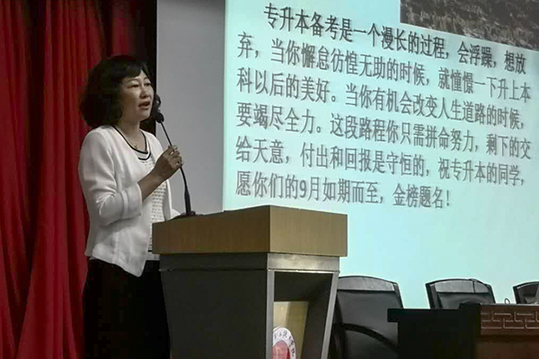 随后,分院郑敏丽院长讲话。郑院长对蓝孟同学通过自身努力考取本科院校深造表示祝贺,同时祝愿蓝孟同学升入本科院校后,学有所成,为母校和分院争得荣誉;鼓励分院全体在校生以蓝孟同学为榜样,树立远大理想,脚踏实地,持之以恒,用青春与汗水、知识与毅力,创造自己光明的前程,谱写人生美好的华章!