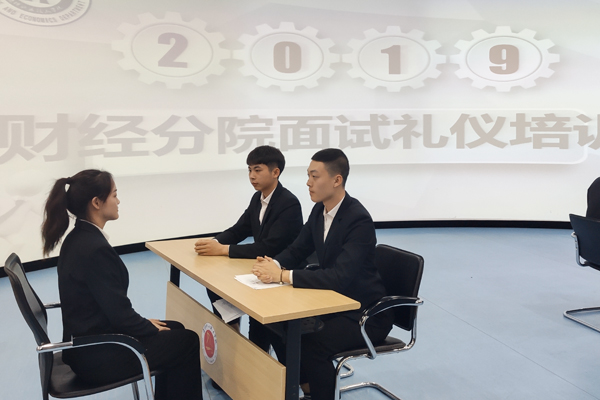 在韩祥祚老师讲解后,由财经分院王跃副书记和2017级各班班长组织全体同学按照面试礼仪的要求进行模拟面试。同学们的一言一行展现出面试礼仪行为的规范性,以及机智与敏锐的思维。韩老师耐心地指出并纠正同学们在模拟面试环节出现的不正确不规范表现,为同学们在以后的面试中表现更加出色。