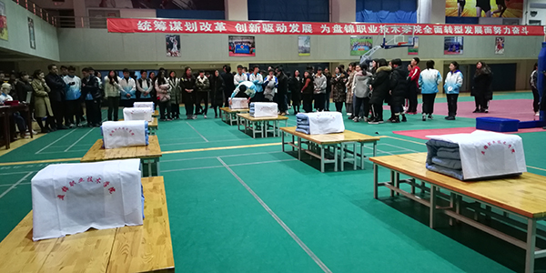 2017年12月24日晚18时30分,盘锦职业技术学院第四届内务整理大赛在我校体育馆三楼成功举办。学院学生工作处邓红伟处长、张春波副处长、以及各分院系书记、副书记、辅导员老师参加了本次活动。比赛分为男生组和女生组,共有48名同学分别代表着8个分院系内务整理的最高水平参与到活动中来。担任本次活动评委工作的老师是每栋公寓宿舍的管理老师,他们有着丰富的日常管理和检查经验。本次活动秉持公平公正的原则,在规定时间内,以军人的标准要求叠出“豆腐块”被子。