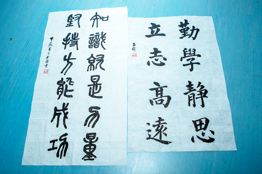 芦韵书社的张玉伟、张欣、赵子漪、韩丽荣四位老师,满怀着对新时代少年儿童健康成长的厚望,以及对中华传统书法文化的无比热爱之情,在学校图书馆二楼芦韵书社活动室,为处于基础教育阶段的22名三部教师的子女,创作了22副儿童节励学书法作品。