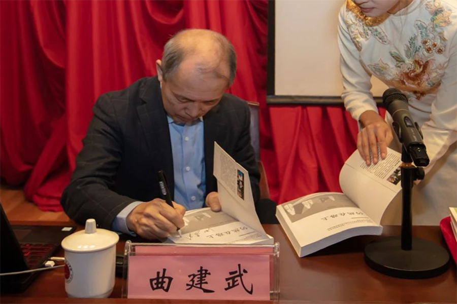 曲建武教授现场签字赠书,将其著作《仍然在路上》《我与大学生朋友们的交流》两本书赠予我校师生代表。