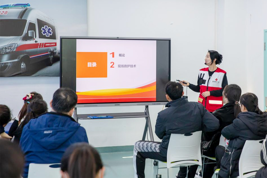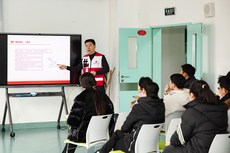 本次培训由盘锦市红十字会应急救护师资服务队孙靖涛老师主讲,内容涵盖了急救基础知识、心肺复苏术(CPR)、AED(自动体外除颤器)的正确使用方法以及多种包扎技巧等。