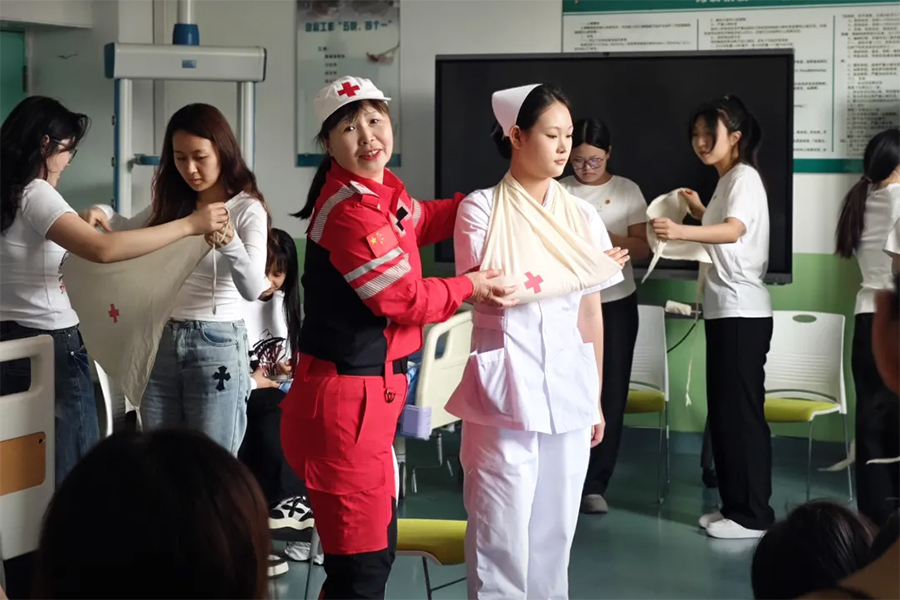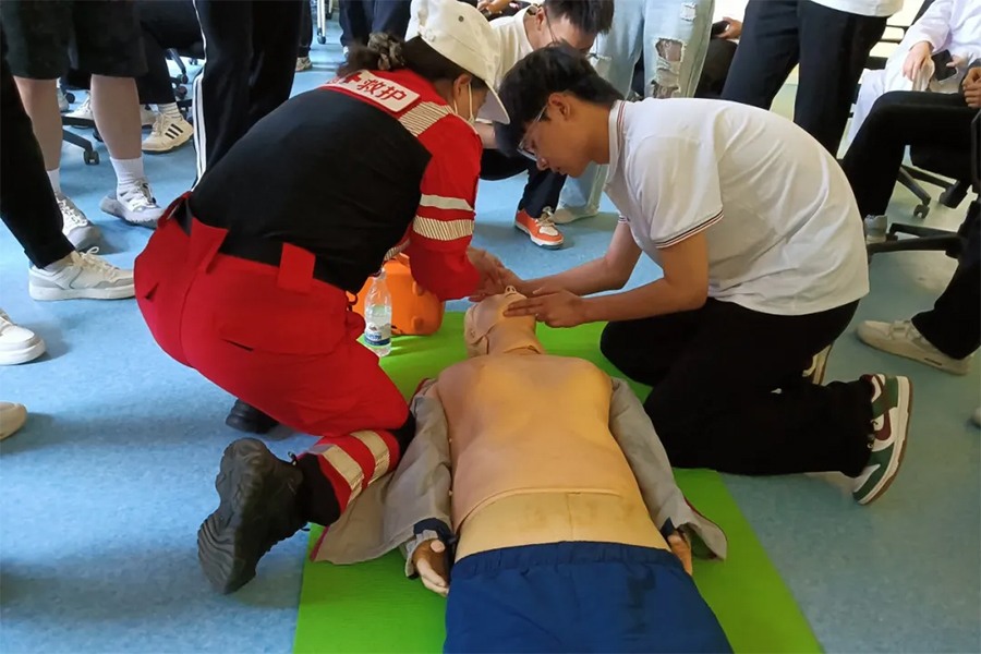 在救援环节,辽东湾新区消防救援大队出动云梯车搭建“空中生命通道”,内攻小组与搜救小组协同配合,成功营救3名“被困”学生。演练还设置医疗救援场景,盘锦市红十字应急救护服务队现场演示止血包扎、心肺复苏等急救技能,强调“黄金四分钟”救援原则,指导师生掌握“快、准、轻、牢”的包扎要领与“C-A-B”心肺复苏操作流程。