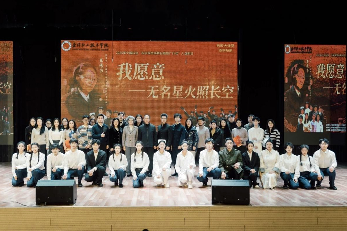 为深入贯彻落实中国科协、教育部、文化和旅游部、中国科学院、中国工程院、共青团中央、中国文联等七部委联合印发的《关于2025年“科学大师宣传工程”工作安排的通知》精神,推动科学家精神进校园走深走实,2025年12月12日下午,由我校师生自编自导自演的原创思政短剧《我愿意——无名星火照长空》在校文化中心演播厅隆重首演。学校党委副书记李兵,团委、思政教研部师生代表共700余人齐聚一堂,共同观看这场由我校青年学子演绎的忠诚与奉献之歌。现场反响热烈,掌声如潮,感人至深。