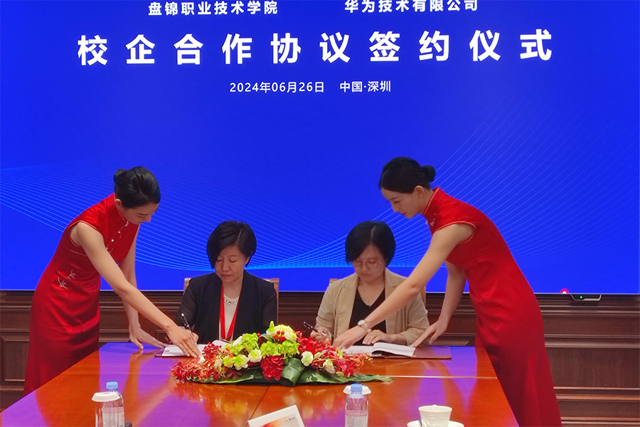 6月26日,盘锦职业技术学院与华为技术有限公司签署校企合作协议,授牌盘锦职业技术学院成立华为鲲鹏产业学院。校长宋锦、副校长李辉、教务处处长张洪雷、信息学院院长孙伟,华为技术有限公司教育行业总监李声阳、辽宁商业总经理赵梓含、辽宁中部区域商业经理姚宏斌等相关负责人出席签约仪式。签约仪式由李声阳主持,宋锦和赵梓含分别代表双方签约。