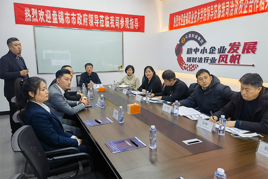 为进一步深化校企合作,广泛开拓就业渠道和就业岗位,全力促进我院学生顺利实习就业,2023年12月19日,盘锦市政府副秘书长张利民、盘锦职业技术学院校长宋锦,带领盘锦职业技术学院经济管理学院党支部书记张长江、院长周晓娟、教务处副处长张洋铭、经济管理学院副院长安彬、大数据与会计教研室主任耿一丁,前往亿嘉财道企业管理(辽宁)集团有限公司和盘锦人瑞服务外包有限公司开展访企拓岗专项调研工作。