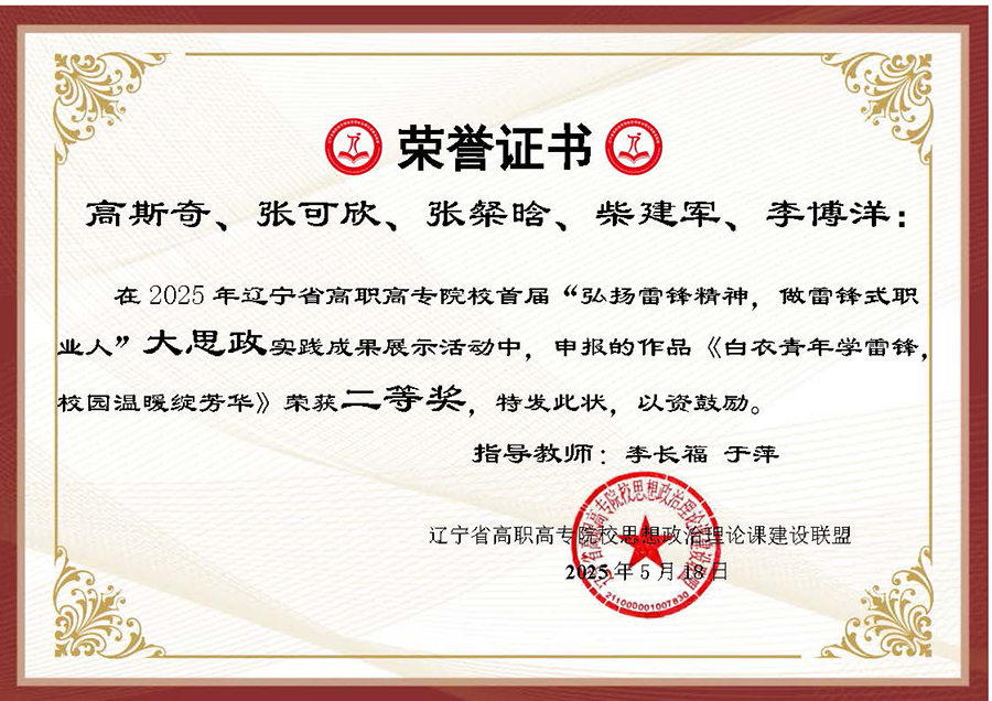为深入贯彻习近平总书记在辽宁考察时的重要讲话和重要指示精神,大力弘扬辽宁“红色六地”文化,贯彻落实省委教育工委、省教育厅作出的《关于组织开展“弘扬雷锋精神,奋斗成就梦想”2025年春季学期“开学第一课”活动的通知》要求,在第62个学雷锋纪念日到来之际,辽宁省高职高专院校思想政治理论课建设联盟面向全省高职高专院校(包括本科院校高职专科)大学生开展了“弘扬雷锋精神 做雷锋式职业人”实践教学成果主题作品征集及展示汇报活动。活动历时两个多月,结果现已揭晓,我校选送作品喜获二、三等奖各两项。