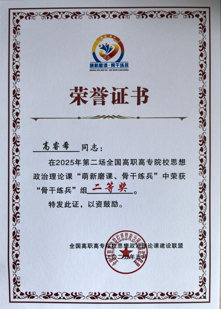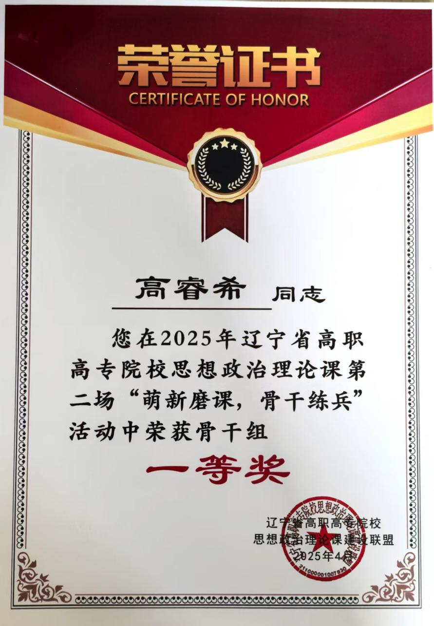 近日,2025年第二场全国高职高专院校思想政治理论课“萌新磨课、骨干练兵”教学展示活动落下帷幕。我校教师高睿希经过辽宁省比赛、全国决赛,荣获辽宁省“骨干练兵组”一等奖、全国“骨干练兵组”二等奖。