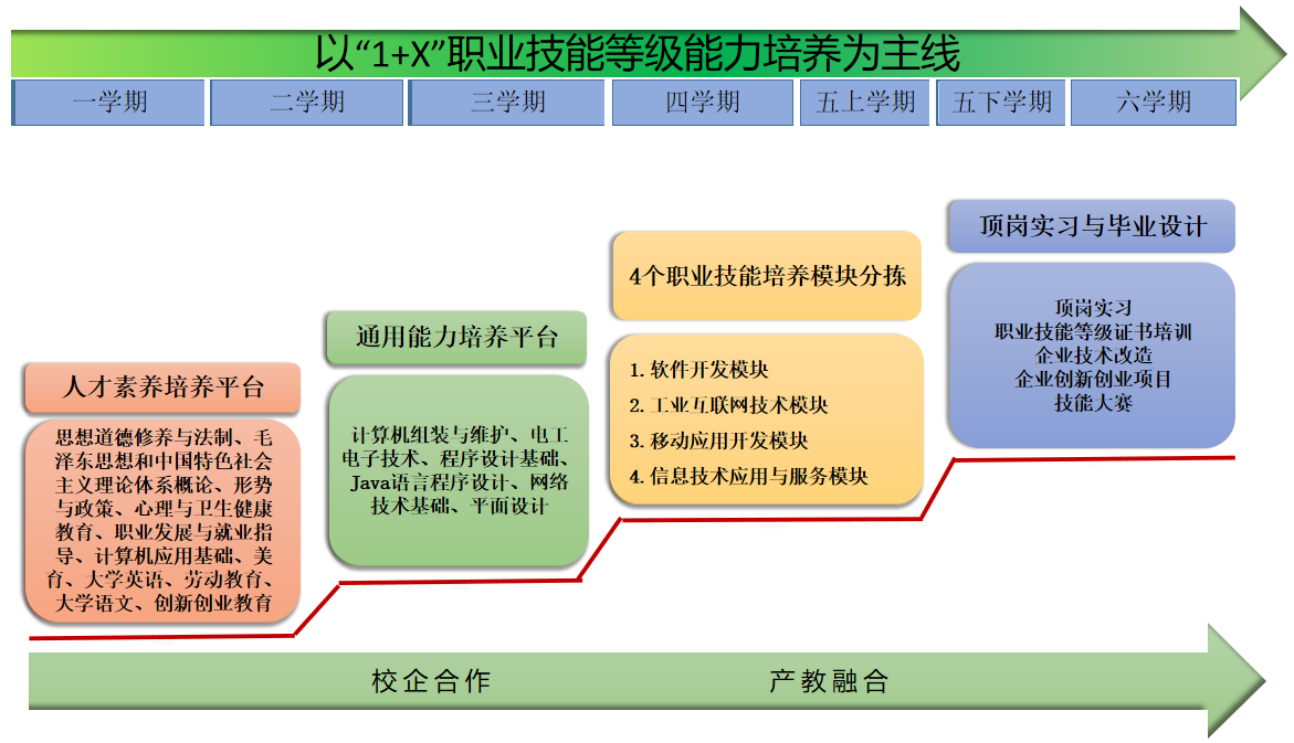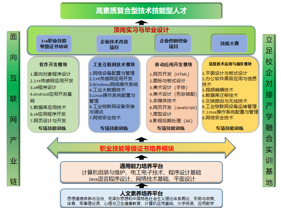 根据计算机应用技术专业特点和职业岗位能力要求,同企业专家共同研究,与大连荣超科技有限公司、辽宁中蓝光电科技有限公司、狼码教育科技有限公司、盘锦泰利达软件技术有限公司、盘锦市辽河数码科技发展有限公司、曙光信息产业股份有限公司、北京新大陆时代教育科技有限公司、锐捷网络股份有限公司、杭州华三通信技术有限公司等企业联合开展产教融合实训基地建设,打造与企业工作环境一致的教学环境,实现教学过程中再现实际生产过程;采取企业师傅带学徒的模式,将企业生产任务、校企合作科研项目、职业技能等级证书培训教学等贯穿于人才培养全过程;利用人文素养培训和通用能力培养作为底层共享平台,旨在培养素养与职业通用能力,其中通用能力培养作为专业基础职业技能等级模块。模块分拣是指三到四学期专业设置“4”个专业职业技能等级模块,要求该专业学生根据职业岗位需求和个人志愿选取1个模块进行学习,课程体系中融入“1+X”传感网职业技能认定课程,课程考核通过后达到相关职业技能等级能力的要求,获得课程学分,达到复合型人才培养目标。考取职业技能等级证书学生可以免修相关课程,获取课程学分,实现岗、课、赛、证融通。