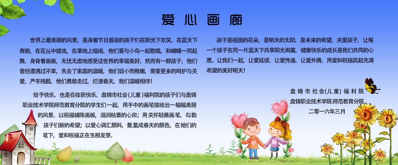 4月20日下午1:30,师范教育分院学生会、团总支部分学生代表在王中宇副书记和辅导员老师的组织带领下,将自己的美术画作捐献给盘锦市社会(儿童)福利院,用一幅幅充满童趣的画作为...